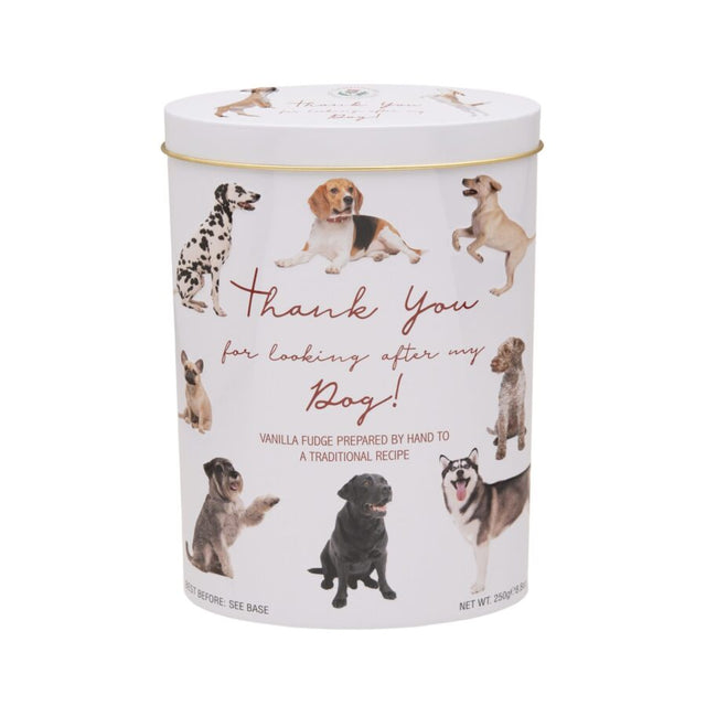 So to say thank you to those that looked after your special bud while you were away, give them the perfect thank you gift of a tin of smooth vanilla fudge contained in a decorative tin featuring illustrations of some of the most popular dog types.